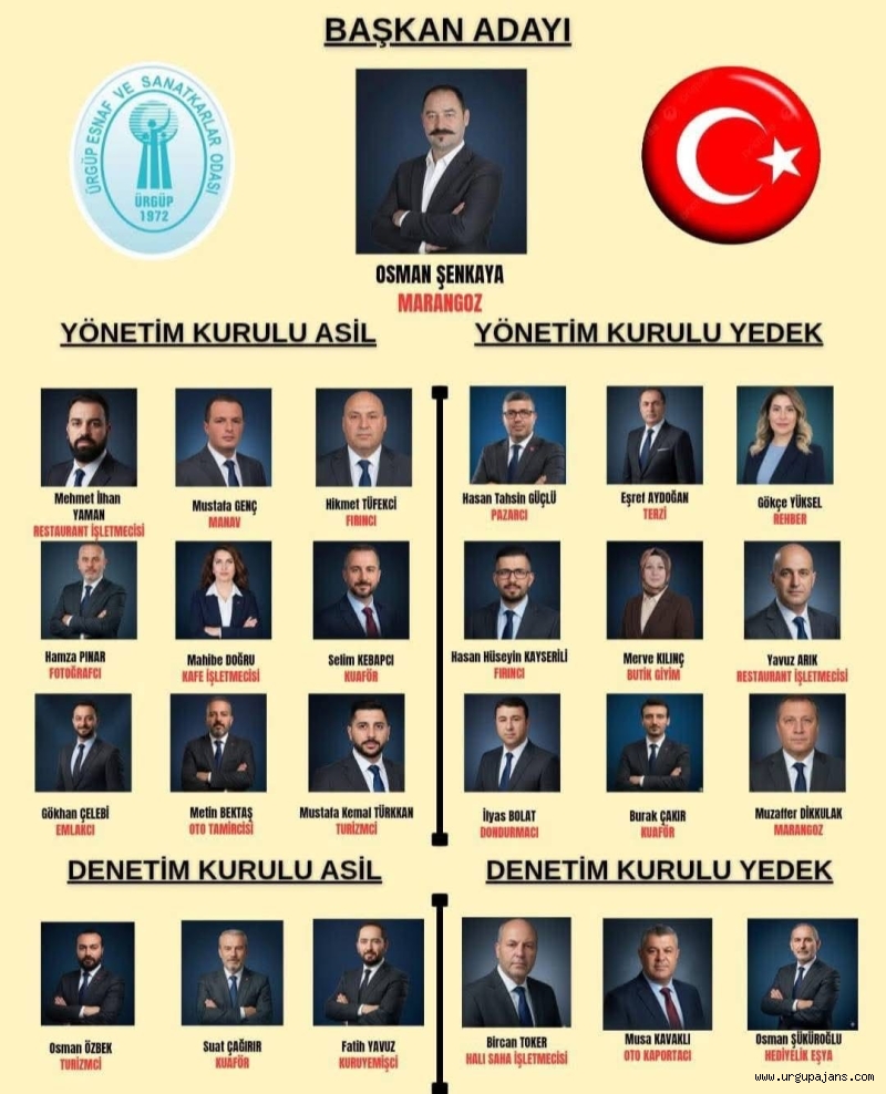 Yapılan sayım sonucunda Sarı Liste’nin adayı Osman Şenkaya 308 oy alarak Ürgüp Esnaf ve Sanatkârlar Odası’nın yeni başkanı oldu. Seçimde adayların aldığı oylar ise şu şekilde açıklandı: